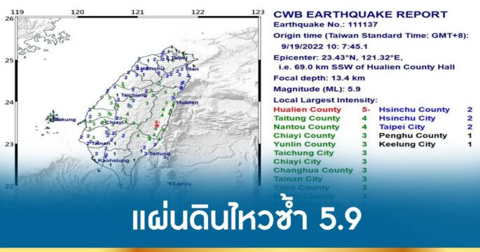 ไทเป 19 ก.ย.- สำนักอุตุนิยมวิทยากลางของไต้หวันแจ้งว่า เกิดแผ่นดินไหวขนาด 5.9 ทางฝั่งตะวันออกของไต้หวันเมื่อเวลา 10:07 น.วันนี้ตามเวลาไต้หวัน ตรงกับเวลา 09:07 น.วันนี้ตามเวลาในไทย หลังจากเกิดแผ่นดินไหวใหญ่ขนาด 6.8 เมื่อบ่ายวานนี้ ศูนย์กลางแผ่นดินไหววันนี้อยู่ห่างจากเทศมณฑลฮวาเหลียนไปทางใต้ค่อนตะวันตกเฉียงใต้ 69 กิโลเมตร ลึกเพียง 13.4 กิโลเมตร มีขนาดความรุนแรงระดับ 5 จากทั้งหมด 7 ระดับ นอกจากนี้ยังวัดความรุนแรงได้ตั้งแต่ระดับ 1-7 ในอีกหลายพื้นที่ทั่วไต้หวัน อย่างไรก็ดี ยังไม่มีรายงานความเสียหายจากแผ่นดินไหวครั้งล่าสุด หลังจากที่มีผู้เสียชีวิต 1 คน บาดเจ็บ 79 คน จากแผ่นดินไหวขนาดความรุนแรง 6.8 ที่เทศมณฑลไถตง ทางตะวันออกเฉียงใต้ช่วงบ่ายวันอาทิตย์.-สำนักข่าวไทย