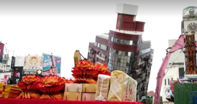 ฮวาเหลียน 5 เม.ย.- กลุ่มคนทำงานจัดเครื่องเซ่นไหว้ในเช้าวันนี้ก่อนที่จะรื้อถอนอาคารหลังหนึ่งในเทศมณฑลฮวาเหลียน ทางตะวันออกของไต้หวันที่เอียงลงมาอย่างน่ากลัวมาตั้งแต่เกิดแผ่นดินไหวขนาดใหญ่เมื่อวันพุธ เครื่องเซ่นไหว้ที่ประกอบด้วยดอกไม้ ผลไม้ กระดาษเงินกระดาษทอง ถูกจัดเรียงอยู่โต๊ะหน้าอาคารดังกล่าว เป็นการเซ่นไหว้เพื่อให้การรื้อถอนอาคารเป็นไปได้วยความราบรื่น ชาวบ้านที่อาศัยอยู่ในละแวกใกล้เคียงเผยว่า ไม่กังวลใจเรื่องการรื้อถอนแต่อย่างใด เพราะทางการได้รับรองความปลอดภัยให้แก่อาคารโดยรอบ แผ่นดินไหวขนาด 7.2 ที่เกิดขึ้นในช่วงเช้าวันที่ 3 เมษายน ทำให้มีผู้เสียชีวิตจนถึงขณะนี้ 10 คน ศูนย์กลางแผ่นดินไหวลึกลงไปในทะเลนอกชายฝั่งเทศมณฑลฮวาเหลียน และมีคนติดค้างอยู่ในอุทยานแห่งชาติทาโรโกะ เนื่องจากหินจากเทือกเขาหล่นลงมาขวางเส้นทาง อย่างไรก็ดี เจ้าหน้าที่กู้ภัยได้เดินทางไปให้การดูแลแล้ว.-814.-สำนักข่าวไทย