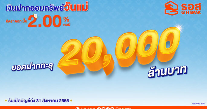 อย่ารอช้า! เพียง 2 วัน ยอดฝากทะลุ 20,000 ล้านบาทแล้ว เงินฝากออมทรัพย์วันแม่ ให้ผลตอบแทนอัตราดอกเบี้ยสูงถึง 2.00% ต่อปี
