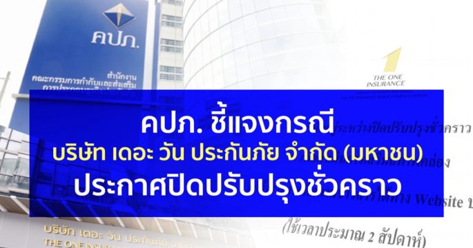 รมว.คลัง มีคำสั่ง “เพิกถอนใบอนุญาตประกอบธุรกิจประกันวินาศภัย เดอะ วัน ประกันภัย” เลขาธิการ คปภ. สั่งตั้งศูนย์ทั่วประเทศให้คำแนะนำ รับเรื่องร้องเรียน อำนวยความสะดวกแก่ผู้เอาประกันภัยทุกพื้นที่ และกองทุนประกันวินาศภัยเข้ารับช่วงจ่ายเคลมประกันเพื่อคุ้มครองสิทธิประโยชน์ของประชาชนอย่างเต็มที่