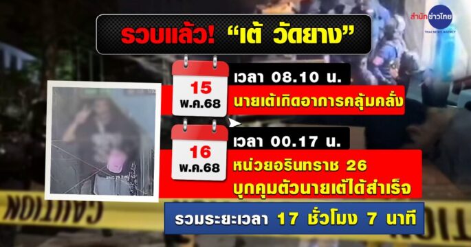 กทม. 16 พ.ค. – ตำรวจคุมตัว “เต้ วัดยาง” ได้แล้ว หลังเจรจานานกว่า 17 ชม. เจ้าตัวมีสภาพอิดโรยอยู่ภายในบ้าน ยืนยันปฏิบัติการยุทธวิธี พร้อมดำเนินคดีข้อหาหนัก จากเหตุเจ้าหน้าที่เข้าปิดล้อมพื้นที่ หลังได้รับแจ้งเหตุว่านายณัฐวัชต์ หรือเต้ อายุ 31 ปี คลุ้มคลั่ง ในบ้านหลังหนึ่งย่านหลังวัดลครทำ เขตบางกอกน้อย กทม. เมื่อเวลา 08.10 น. (15 พ.ค.) มีอาวุธปืน มีดดาบ และระเบิดแสวงเครื่องในครอบครอง ตำรวจต้องปิดกั้นพื้นที่โดยรอบ จุดเกิดเหตุ มีเสียงปืนยิงขึ้นฟ้า 6 นัด ยิงใส่ตำรวจ 3 นัด และยิงสวนออกมาอีก 1 นัด ขณะเกิดเหตุ มีคนอยู่ในบ้าน 4 คน ทั้งหมดอยู่ชั้น 2 ล็อกห้องเรียบร้อย ไม่ได้ถูกจับเป็นตัวประกัน ส่วนนายเต้ อยู่ชั้นล่าง ขณะที่ภรรยาผู้ก่อเหตุไม่ได้อยู่ในบ้านเพราะไปรับลูกที่โรงเรียน ให้ข้อมูลกับสื่อมวลชนว่า […]