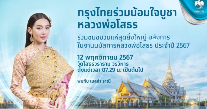 กรุงไทยชวนเที่ยวงานหลวงพ่อโสธร ดึง “เบลล่า ราณี” ร่วมริ้วขบวน “ปักษาวายุภักษ์นครา สู่สายศรัทธาแห่งความยั่งยืน” 12 พ.ย.นี้