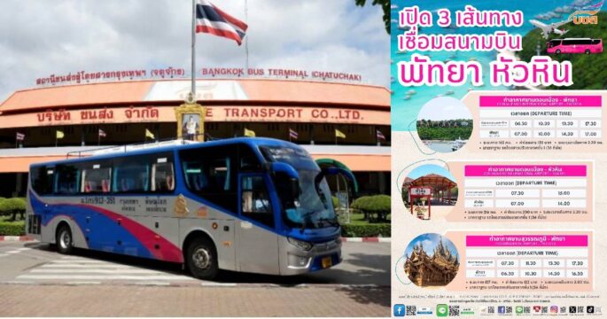 “บขส.” พร้อมเปิดให้บริการ 3 เส้นทาง ดอนเมือง-พัทยา, ดอนเมือง-หัวหิน และ สุวรรณภูมิ-พัทยา เชื่อมสองสนามบิน เริ่ม 8 มี.ค.นี้ เพิ่มความสะดวกการเดินทางไร้รอยต่อ หนุนปีทองแห่งการท่องเที่ยว เมืองหลัก-เมืองรอง เมืองน่าเที่ยวทั่วไทย