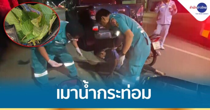 หนุ่มร้านขายผักสด เมาน้ำกระท่อม ขี่ จยย.ชนท้ายรถกระบะจอดริมถนน อ.เมือง จ.ตรัง บาดเจ็บ เลือดกบปาก และยังพบใบกระท่อมสดจำนวนมากอยู่ใต้เบาะรถ จยย.