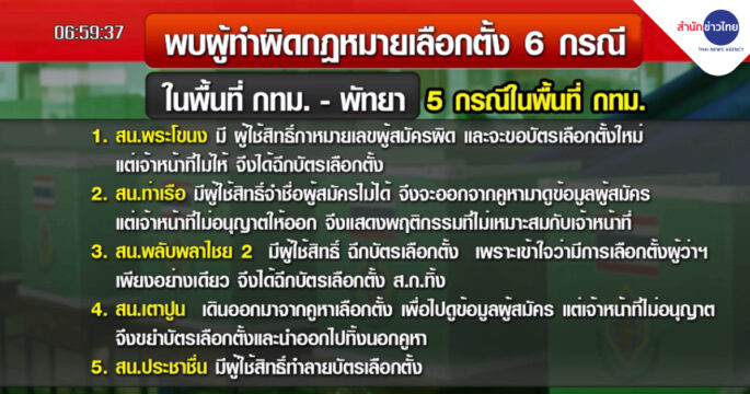 การเลือกตั้งเมื่อวานนี้ ทั้งที่กรุงเทพฯ และพัทยา พบการทำผิดกฎหมายเลือกตั้ง 6 กรณี ทั้งฉีกบัตร และนำบัตรออกมาจากคูหาเลือกตั้ง