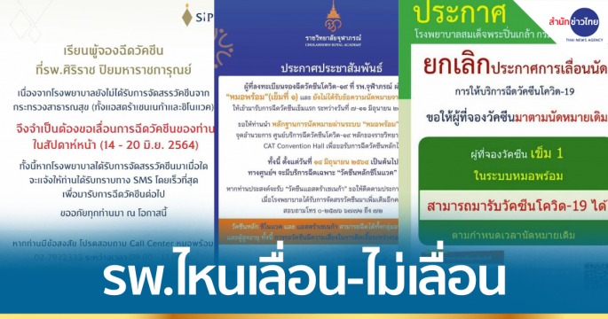 สำนักข่าวไทยรวบรวมข้อมูลโรงพยาบาลที่ประกาศเลื่อนฉีดวัคซีน หรือ ไม่เลื่อนฉีดวัคซีน