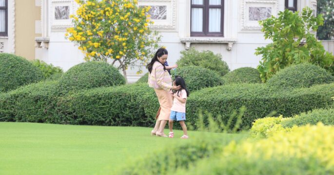 นายกฯ พาลูกสาว-ลูกชาย เดินเล่นสนามหญ้าตึกไทยฯ ก่อนเข้า ประชุมพรรคเพื่อไทย