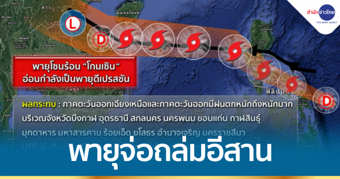 อิทธิพลพายุดีเปรสชัน “โกนเซิน” เคลื่อนเข้ามุกดาหารเเล้ว ช่วงเช้าที่ผ่านมามีฝนตก และลมพัดแรง แม้ว่าแนวโน้มอ่อนกำลังลงเป็นหย่อมความกดอากาศต่ำกำลังแรง แต่ก็อาจส่งผลให้ภาคอีสาน ฝนตกหนักถึงหนักมากบางแห่ง ฝนร้อยละ 80 ของพื้นที่
