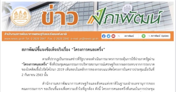 สภาพัฒน์ชี้แจงข้อเท็จจริงเรื่อง “โครงการคนละครึ่ง”ยังมีลักษณะเป็นกรอบกว้าง โดยกระทรวงการคลัง จะต้องไปจัดทำรายละเอียดเพิ่มเติม
