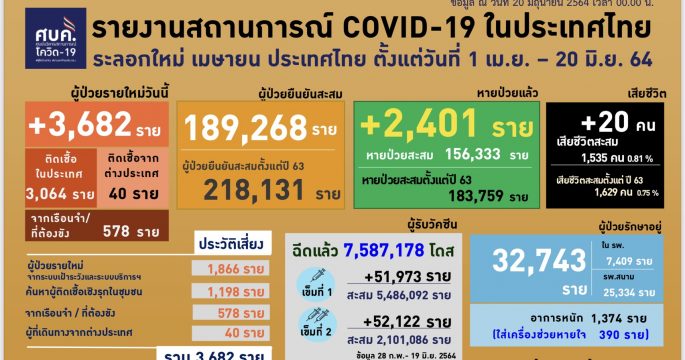 ศบค. เผยยอดผู้ติดเชื้อโควิด-19 รายใหม่ 3,682 คน เสียชีวิต 20 คน กทม. ติดเชื้อใหม่มากสุด 836 คน เร่งระดมฉีดวัคซีนแล้ว 7,587,178 โดส