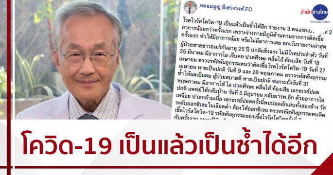 กรุงเทพฯ 4 ก.ย.-“นพ.มนูญ” เผยโควิด-19 เป็นแล้วเป็นซ้ำได้อีก ขณะที่เชื้อกลายพันธุ์อยู่ตลอด ในช่วงที่ยังต้องรอวัคซีน ขอคนไทยทุกคนคงการปฏิบัติตัวยุค New Normal สวมหน้ากากอนามัย-เว้นระยะห่าง-ล้างมือบ่อยๆ นพ.มนูญ ลีเชวงวงศ์ แพทย์เฉพาะทางด้านโรคระบบการหายใจผู้ป่วยหนักและโรคผู้สูงอายุ โรงพยาบาลวิชัยยุทธและประธานชมรมเชื้อราทางการแพทย์ประเทศไทย โพสต์ผ่านเพจเฟซบุ๊ก “หมอมนูญ ลีเชวงวงศ์ FC” วันนี้ (4ก.ย.) ว่า โรคไวรัสโควิด-19 เป็นแล้วเป็นซ้ำได้อีก รายงาน 3 คนแรกเป็นครั้งที่ 2 อาการน้อยกว่าครั้งแรก เพราะร่างกายมีภูมิต้านทานจากการติดเชื้อครั้งแรก ทำให้มีอาการน้อย หรือไม่มีอาการเลย ยกเว้นรายงานล่าสุด ผู้ป่วยชายชาวอเมริกันอายุ 25 ปี ปกติแข็งแรง ไม่มีโรคประจำตัว วันที่ 25 มีนาคม มีอาการไอ เจ็บคอ ปวดศีรษะ คลื่นไส้ ท้องเสีย วันที่ 18 เมษายน ตรวจรหัสพันธุกรรมพบว่าติดเชื้อโรคไวรัสโควิด-19 วันที่ 27 เมษายน หายเป็นปกติ วันที่ […]