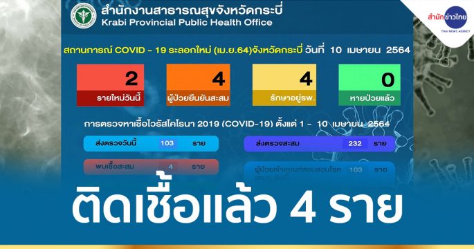 จ.กระบี่ ยอดติดเชื้อระลอกใหม่ พุ่ง 4 ราย รอผลตรวจ 49 ราย มีไทม์ไลน์ 1 ราย เดินทางไปร้านอาหาร แหล่งท่องเที่ยวหลายแห่ง ขณะที่คณะกรรมการควบคุมโรคติดต่อจังหวัดกระบี่ ประกาศให้ผู้ที่เดินทางมาจาก 9 จังหวัด กลุ่มเสี่ยง ต้องบันทึกข้อมูลการเดินทางลงในระบบ QT 14 และปฏิบัติตามมาตรการกระทรวงสาธารสุขอย่างเคร่งครัด