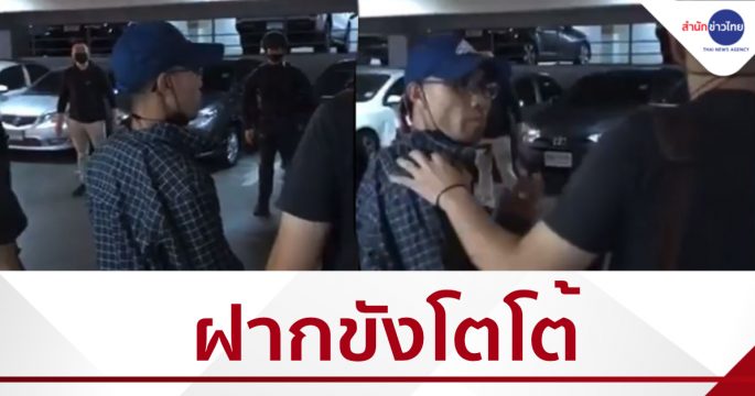 ตำรวจชุดอรินทราช คุมตัว “โตโต้” แกนนำกลุ่มการ์ดวีโว่ บริเวณลานจอดรถห้างเมเจอร์รัชโยธิน ไปสอบปากคำที่ ตชด. ภาค1