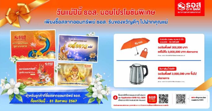 ธอส.จัดโปรโมชันต้อนรับเทศกาลวันแม่ ซื้อสลากออมทรัพย์ตั้งแต่วันนี้ถึง 31 สิงหาคม 2567 รับของสมนาคุณพิเศษ