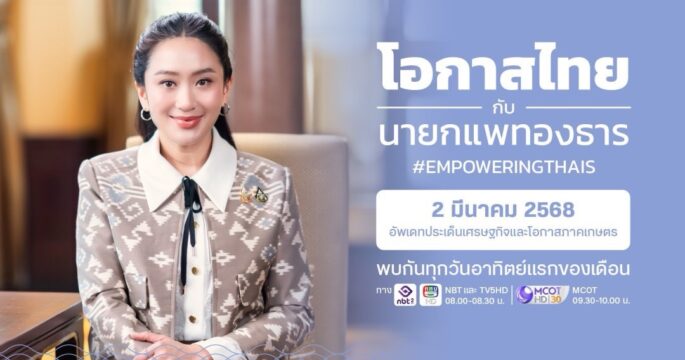 นายกฯ อัปเดตประเด็นเศรษฐกิจและอนาคตภาคเกษตร สองนโยบายเครื่องมือสำคัญในการยกระดับเศรษฐกิจไทยในรายการ “โอกาสไทยกับนายกฯ แพทองธาร” วันอาทิตย์ที่ 2 มีนาคมนี้ ต้องติดตาม