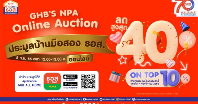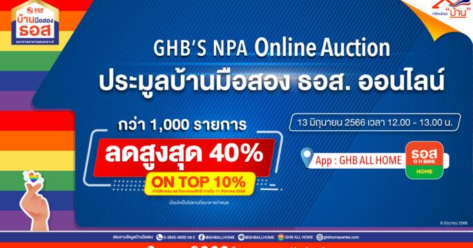 กรุงเทพฯ 8 มิ.ย.- ธอส. ประมูลบ้านมือสองออนไลน์ จัดทรัพย์เด่นกว่า 1,000 รายการ ให้ลดสูงสุดถึงร้อยละ 40 และ On Top อีกร้อยละ 10 ในงาน GHB’S NPA Online Auction วันอังคาร 13 มิ.ย. 66 นี้