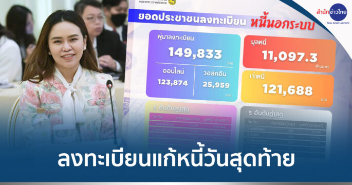 มท. เผย วันนี้ (29 ก.พ.67) ลงทะเบียนแก้หนี้นอกระบบวันสุดท้าย “อนุทิน” บอก เร่งเคลียร์ฐานข้อมูลลูกหนี้ เจ้าหนี้ ติดสปีดกระบวนการไกล่เกลี่ย พร้อมให้ความรู้เสริมสร้างงาน เกิดอาชีพ มีรายได้