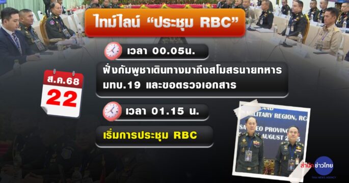 สระแก้ว 22 ส.ค. – การประชุมคณะกรรมการชายแดนส่วนภูมิภาคไทย – กัมพูชา (RBC) สมัยวิสามัญ ที่สโมสรนายทหาร มณฑลทหารบกที่ 19 จ.สระแก้ว วานนี้ (21 ส.ค.) กำหนดเวลา 14.00 น. แต่กัมพูชาเดินทางมาถึงตอนเที่ยงคืน ขอตรวจเอกสาร กว่าจะได้ประชุม 01.15 น. การประชุมคณะกรรมการชายแดนส่วนภูมิภาคไทย – กัมพูชา (RBC) สมัยวิสามัญ กองทัพภาคที่ 1 นำโดย พลตรี สุรวิชญ์ แดงจันทร์ เสนาธิการกองทัพภาคที่ 1 เป็นประธานคณะทำงาน ฝ่ายไทย ขณะกัมพูชา นำโดย พลโท ซอ กึมปะ รองผู้บัญชาการภูมิภาคทหารที่ 5 เป็นการนำข้อตกลง 13 ข้อ จากการประชุมคณะกรรมการชายแดนทั่วไป ที่มาเลเซีย เมื่อวันที่ 7 สิงหาคม มาทำข้อตกลง […]