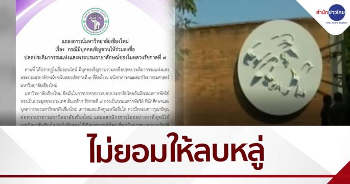 ม.เชียงใหม่ ออกแถลงการณ์ จะไม่ยินยอมให้เกิดการกระทำใดๆ ที่จะเป็นการลบหลู่พระเกียรติของ ในหลวงรัชกาลที่ 9 ไม่ว่าจะในรูปแบบใดก็ตาม หลังมีคนโพสต์ทวิตเตอร์ชวนลงชื่อปลดประติมากรรมแสง