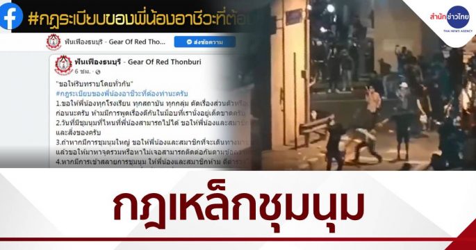 เหตุการณ์ชุลมุนแยกบางนา หลังกลุ่มคณะราษฎร 63 ประกาศยุติการชุมนุมช่วง 2 ทุ่มวานนี้ โดยปรากฏภาพกลุ่มคนขว้างปาก้อนหิน ทำลายป้อมตำรวจ ซึ่งในภาพพบมีบุคคลที่สวมเสื้อช็อปของสถาบันอาชีวะ ด้านแอดมินเพจ ฟันเฟืองธนบุรี ยืนยัน กลุ่มอาชีวะ มีกฎระเบียบ เพื่อเป็นแนวปฏิบัติในการร่วมชุมนุมอย่างชัดเจน 7 ข้อ ห้ามทำร้ายตำรวจและสิ่งของ
