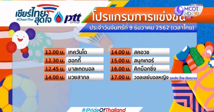 โปรแกรมการแข่งขันกีฬาซีเกมส์ 2019 ที่น่าสนใจของนักกีฬาไทย (ตามเวลาไทย) ประจำวันจันทร์ที่ 9 ธันวาคม 2562 มีให้ลุ้นกันตลอดวัน โดยเฉพาะวอลเลย์บอลหญิง รอบชิงชนะเลิศ ไทย พบ เวียดนาม เวลา 17.00 น.