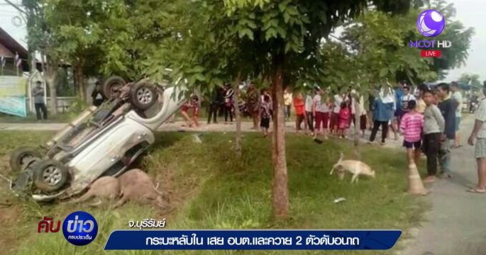 เผยภาพวงจรปิดรถกระบะ เสียหลักพุ่งชนต้นไม้หน้า อบต.บ้านยาง อ.พุทไธสง จ.บุรีรัมย์ ทำให้สมาชิก อบต. ซึ่งยืนเลี้ยงวัวอยู่ เสียชีวิต และกระบือ 2 แม่ลูก ตายคาที่