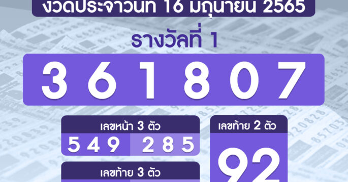 ผลรางวัลสลากกินแบ่งรัฐบาล งวดวันที่ 16 มิถุนายน 2565