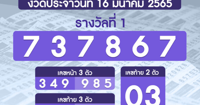 ผลรางวัลสลากกินแบ่งรัฐบาล งวดวันที่ 16 มีนาคม 2565 16/03/2565 15:52 FacebookFacebookXTwitterLINELine 273 ผลรางวัลสลากกินแบ่งรัฐบาล งวดวันที่ 16 มีนาคม 2565