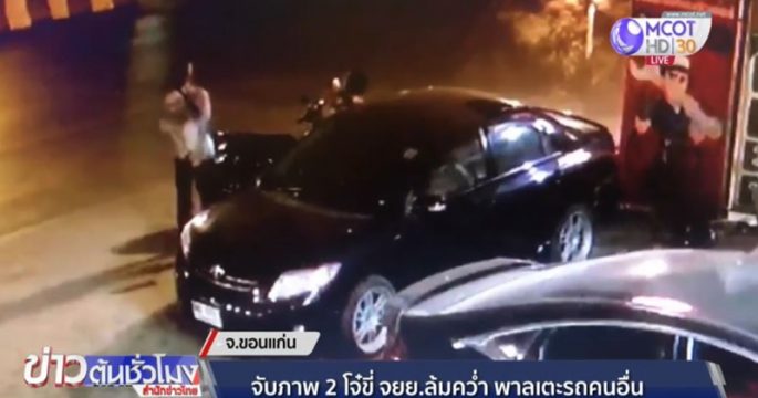 จับภาพ 2 โจ๋ขี่ จยย.ล้มคว่ำกลางเมืองขอนแก่น ก่อนเตะกระจกรถเก๋งจอดใกล้เคียงพัง