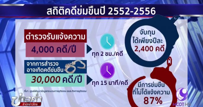 เปิดข้อมูลสถิติคดีข่มขืนที่เกิดตั้งแต่ปี 2552-2556 เฉลี่ย 4 ปี ตำรวจรับแจ้งความคดีข่มขืน 4,000 คดี/ปี แต่มีการคาดการณ์ว่าอาจมีคดีข่มขืนจริงมากถึง 30,000 คดี/ปี หรือทุก 15 นาที/คดี นั่นเท่ากับว่ามีเหยื่อถูกข่มขืนไม่ได้เข้าแจ้งความมากถึงร้อยละ 87