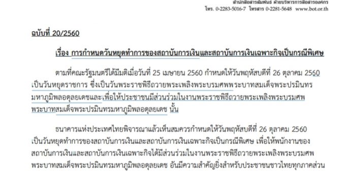 ธปท.ประกาศวันหยุดกรณีพิเศษ 26 ต.ค. 03/05/2560 05:43 FacebookFacebookXTwitterLINELine 10 ธปท.ประกาศเพิ่มวันหยุดสถาบันการเงินกรณีพิเศษ 26 ต.ค.นี้ ตามมติ ครม.