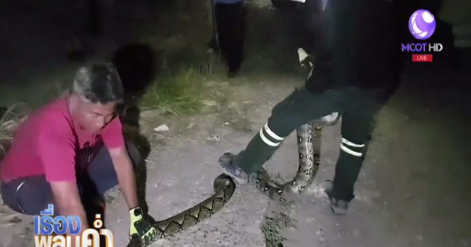 ผวางูจงอางยักษ์ยาว 5 เมตร เลื้อยเข้าซุกกองทางปาล์มข้างบ้านนาน 2 วัน ไม่ไปไหน จนต้องแจ้งกู้ภัยมาช่วยจับไปปล่อย และใช้คนช่วยกันจับถึง 5 คน