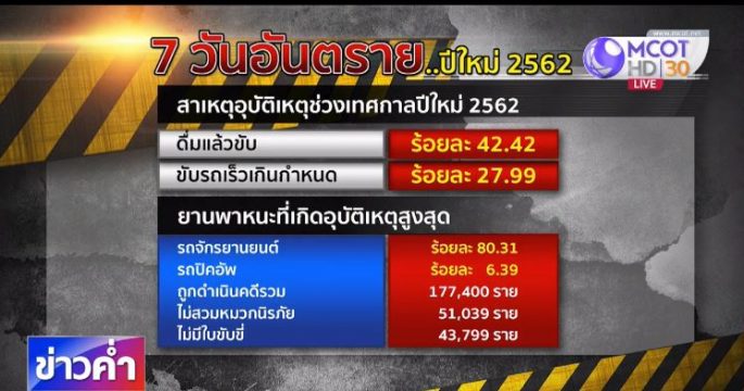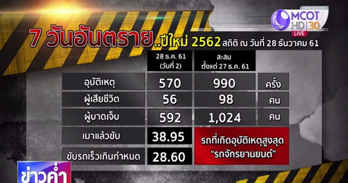 วันที่ 2 ของ 7 วันระวังอันตรายช่วงเทศกาลปีใหม่ 2562 มีผู้เสียชีวิต 56 คน รวมสะสม 98 คน สาเหตุของอุบัติเหตุยังเป็นเมาแล้วขับ เชียงใหม่ครองแชมป์อุบัติเหตุสะสมสูงสุด