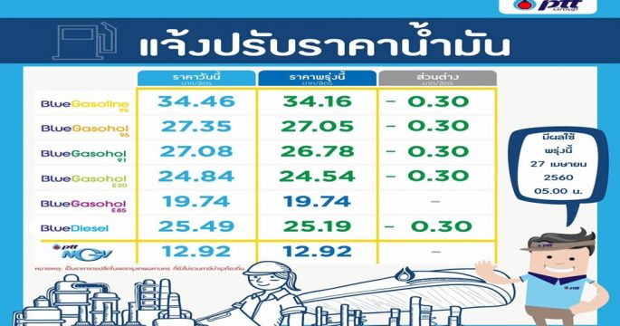 ปตท.-บางจากฯ ลดน้ำมันทุกชนิด 30 สต. ยกเว้น E 85 คงเดิม มีผล 27 เม.ย.นี้