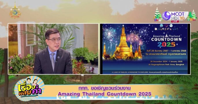 ททท.เชิญชวนร่วมงาน “Amazing Thailand Countdown 2025” รับเทศกาลส่งท้ายปีเก่า ต้อนรับปีใหม่ โดยกรุงเทพฯ จัดที่สวนนาคราภิรมย์ ตรงข้ามวัดอรุณราชวราราม วันที่ 28 ธ.ค.67-1 ม.ค.68 ส่วนภูมิภาค จัดที่อุทยานหลวงราชพฤกษ์ จ.เชียงใหม่ 21-31 ธ.ค.นี้