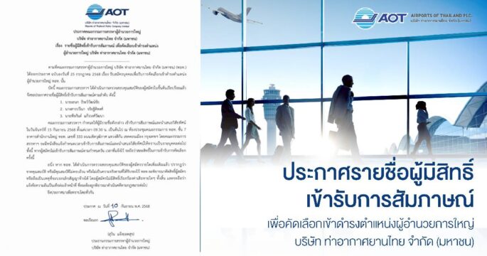 กรุงเทพ 11 ก.ย. – AOT ประกาศรายชื่อผู้มีสิทธิ์เข้ารับการสัมภาษณ์ เพื่อคัดเลือกเข้าดำรงตำแหน่งผู้อำนวยการใหญ่ AOT ตามที่ บริษัท ท่าอากาศยานไทย จำกัด (มหาชน) หรือ AOT ได้ประกาศรับสมัครบุคคลเพื่อดำรงตำแหน่ง ผู้อำนวยการใหญ่ AOT ระหว่างวันที่ 4 – 26 สิงหาคม 2568 นั้น บัดนี้ คณะกรรมการสรรหาผู้มีสิทธิ์เข้ารับการสัมภาษณ์ เพื่อคัดเลือกเข้าดำรงตำแหน่งผู้อำนวยการใหญ่ AOT ซึ่งมี พลเรือเอก สุวิน แจ้งยอดสุข เป็นประธาน ได้ดำเนินการตรวจสอบคุณสมบัติของผู้สมัครในขั้นต้นเรียบร้อยแล้ว จึงขอประกาศรายชื่อผู้มีสิทธิ์เข้ารับการสัมภาษณ์เพื่อคัดเลือกเข้าดำรงตำแหน่งผู้อำนวยการใหญ่ AOT จำนวน 3 ราย ดังนี้