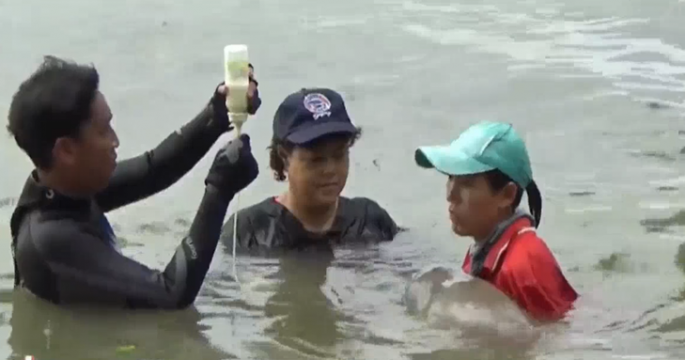 Many tourists flocked to see the orphaned baby dugong during her feeding time and play time with volunteers off Libong Island, especially on weekends.