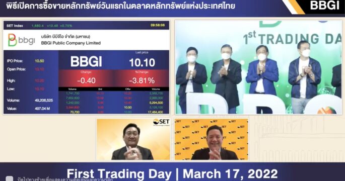 ผู้บริหาร ตลท.ร่วมยินดีและเปิดการซื้อขายหลักทรัพย์บมจ. บีบีจีไอ อย่างเป็นทางการแล้ววันนี้ ด้วยมูลค่าหลักทรัพย์ ณ ราคา IPO 15,183 ล้านบาทใช้ชื่อย่อในการซื้อขายหลักทรัพย์ ว่า “BBGI”