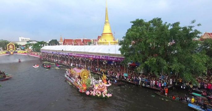 Huge crowds of people flock into Wat Bang Phli Yai to reserve space along the Sam Rong canal to participate in a traditional lotus reception ceremony.