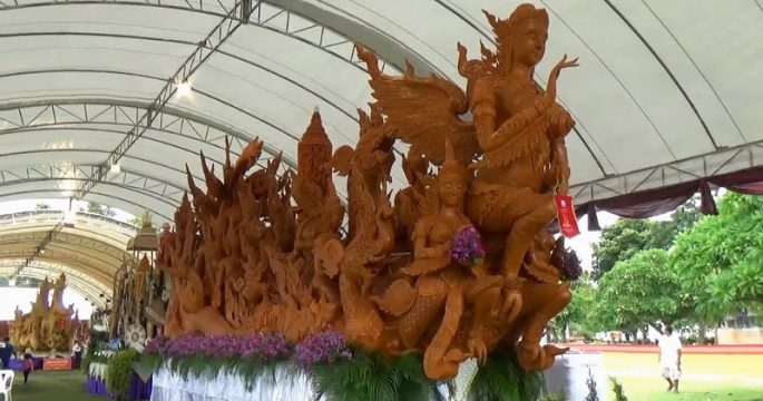 Meticulously carved candles have been put on displayed at the Thung Si Mueang in the northeastern province of Ubon Ratchathani under new normal.