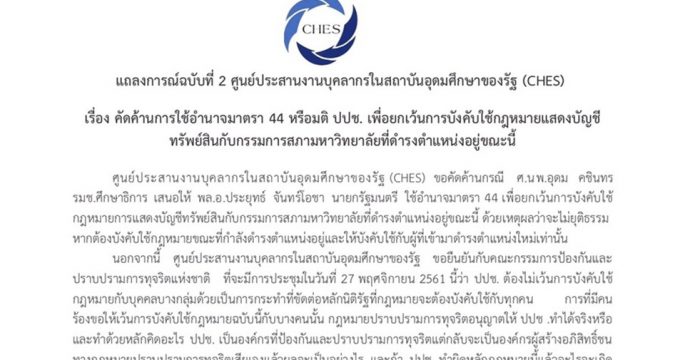 CHES ออกแถลงการณ์ฉบับ 2 ค้านเสนอนายกฯใช้ ม.44 พร้อมเตรียมตีแผ่ปัญหาทุจริตในรั้วอุดมศึกษา