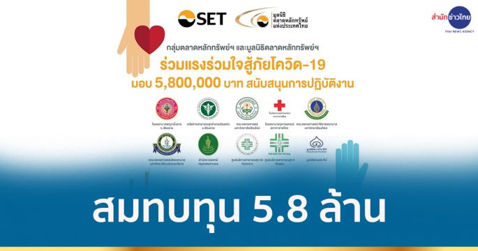ตลาดหลักทรัพย์แห่งประเทศไทย และมูลนิธิตลาดหลักทรัพย์แห่งประเทศไทย ร่วมบรรเทาความเดือดร้อนของประชาชนจากสถานการณ์ COVID-19 สมทบทุน 5.8 ล้านบาท มอบโรงพยาบาลและหน่วยงานด้านสาธารณสุข 10 แห่ง เพื่อจัดซื้ออุปกรณ์ทางการแพทย์