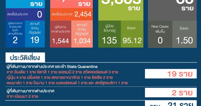 Thailand reported 21 new cases of Covid-19, arriving from other countries, including two Thai women, sneaking across the border from Myanmar.