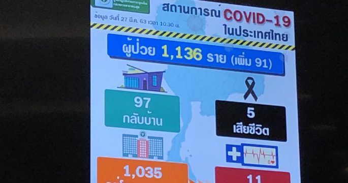 Thai Public Health Ministry reports one more Covid-19 death and 91 new patients, raising the total cases in the country to 1,136.