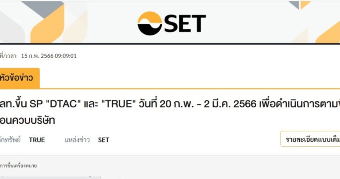 กรุงเทพ 15 ก.พ.-ตลาดหลักทรัพย์แห่งประเทศไทย (ตลท.) ขึ้นเครื่องหมาย SP หุ้นบมจ.โทเทิ่ล แอ็คเซ็ส คอมมูนิเคชั่น (DTAC)และ บมจ. ทรู คอร์ปอเรชั่น (TRUE) ในวันที่ 20 ก.พ. 2566 ถึงวันที่ 2 มี.ค. 2566