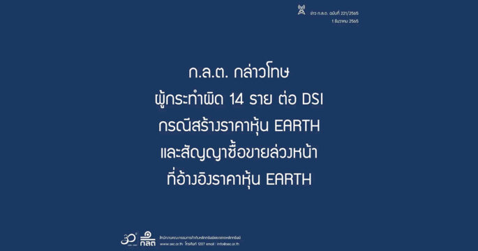 ก.ล.ต. กล่าวโทษผู้กระทำผิด 14 ราย ต่อ DSI สร้างราคาและสัญญาซื้อขายล่วงหน้าที่อ้างอิงราคาหุ้น EARTH