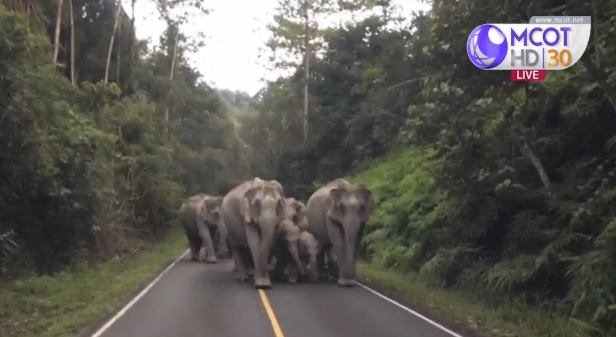 Motorists are warned of wild elephants, roaming on a road, running through the Khao Yai National Park in Prachin Buri.