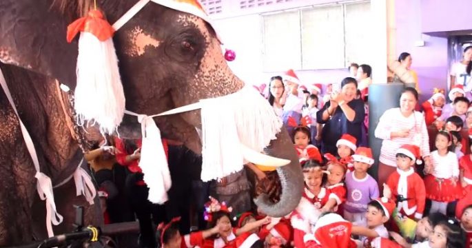 Elephants in Santa Claus outfits take a Christmas outing to put smiles on the faces of school students in Thailand’s former capital of Ayutthaya.