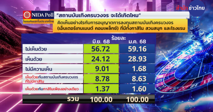 22 มิ.ย.- นิด้าโพลเผยผลสำรวจคนไทยส่วนใหญ่ ไม่เอา! “เอ็นเตอร์เทนเมนต์คอมเพล็กซ์” สถาบันบัณฑิตพัฒนบริหารศาสตร์ เปิดเผยผลการสำรวจความคิดเห็นของประชาชน เรื่อง “สถานบันเทิงครบวงจร หรือ เอ็นเตอร์เทนเมนต์คอมเพล็กซ์ จะได้เกิดไหม พบว่า เสียงส่วนใหญ่ไม่เห็นด้วยทั้งสถานบันเทิงครบวงจรและกาสิโน ซึ่งลดลงเล็กน้อยเมื่อเทียบกับผลสำรวจเมื่อเดือนมกราคมที่ผ่านมา ขณะที่จำนวนผู้เห็นด้วยก็ลดลงตามเช่นกัน อยู่ที่ร้อยละ 1.3 แต่สัดส่วนผู้ที่บอกยังไงก็ได้เพิ่มขึ้นชัดเจน จากร้อยละ 1.68 เมื่อเดือนมกราคม เป็นร้อยละ 9.01 ในเดือนมิถุนายน     อย่างไรก็ตาม ประชาชนถึงร้อยละ 84.15 ไม่เห็นด้วยกับแนวทางการลงทุนสถานบันเทิงครบวงจรของรัฐบาล ซึ่งไม่ใช้งบประมาณของรัฐในการดำเนินการ ขณะที่สัดส่วนผู้เห็นด้วยอยู่ที่ร้อยละ 11.31   ในส่วนของมาตรการของรัฐบาลในการป้องกัน การป้องกันและควบคุมผู้เข้าใช้บริการกาสิโน พบว่า ตัวอย่าง ร้อยละ 81.47 ระบุว่า ไม่เห็นด้วยทั้งสถานบันเทิงครบวงจรและกาสิโน ห่างจากกลุ่มผู้เห็นด้วยถึงเกือบร้อยละ 70  เสียงส่วนใหญ่ ถึงร้อยละ 78.21 ยังไม่เห็นด้วยกับการนำรายได้จากสถานบันเทิงครบวงจร ไปใช้เพื่อสนับสนุนทุนการศึกษา การลงทุนในโครงสร้างพื้นฐาน และการช่วยเหลือกลุ่มเปราะบาง ส่วนกรณีรัฐบาลจะพิจารณา ร่าง พ.ร.บ. […]