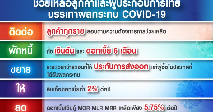 EXIM BANK ติดตามลูกค้าทุกราย พร้อมพักชำระหนี้และดอกเบี้ย 6 เดือน และให้เงินกู้ดอกเบี้ยต่ำ 2% แก่ผู้ประกอบการทุกกลุ่มอุตสาหกรรม ระยะเวลาชำระคืน 7 ปี วงเงิน 20-100 ล้านบาท รวมทั้งพิจารณาเป็นรายกรณีเพิ่มเติมตามความจำเป็น